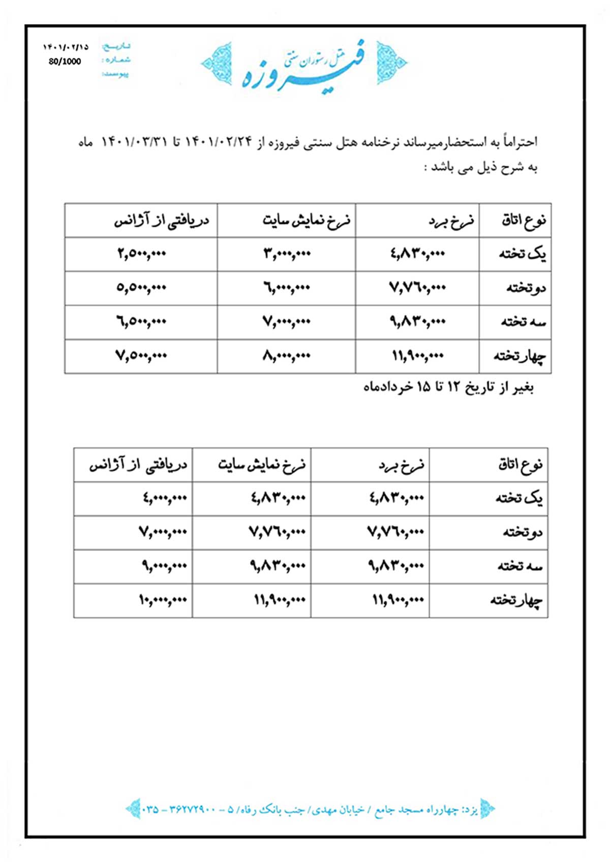 هتل سنتی 3 ستاره فيروزه يكی از يادگار های معماری نياكانمان است كه در بافت تاريخی يزد و در نزديكی مسجد جامع ، مجموعه اميرچخماق و بازارهای سنتی يزد به مدد عشق و هنر بازسازی شده و اكنون با نمايی زيبا و حياط هايی چشم نواز اقامتی رويايی را به مهمانان خود هديه می نمايد.